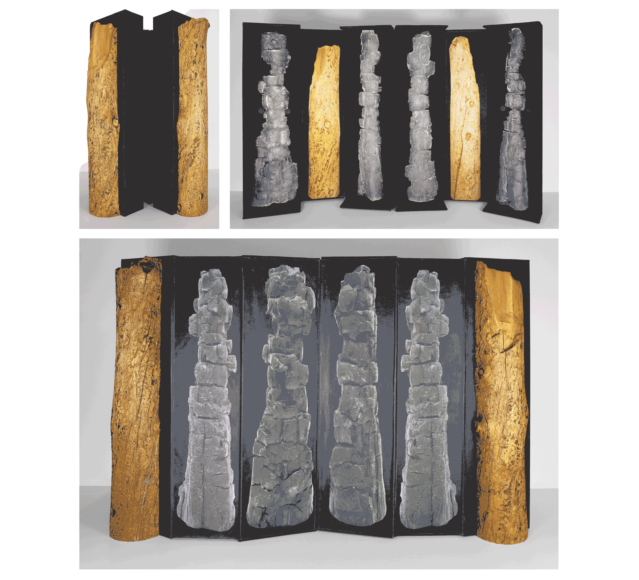“Bark Beetle Book Vol. XLIII: Multifactorial” Artist book: Epoxy casts of burned branch, actual branch with mountain pine beetle galleries, photographs of casts printed on fabric, book board, and book cloth. Structure is accordion-folded, hinged boxes. 4.25"W x 14"H x 2.25"D (2025). Forests face many threats these days, two of the most obvious being wildfires and bark beetles. Both are exacerbated by heat and drought brought on by a warming climate.